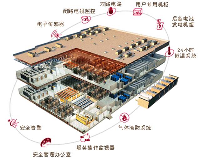 机房采用三路高压供电,供电容量为20000KVA。双路冗余(1+1) UPS电源、超大功率的3组备份柴油发电机组提供7800KVA可靠的后备供电能力,从而保障充足、持续的电力供应,保证99.99%以上的持续供电率。正常状态下,通过UPS保护设备免受电压波动和电流噪音的影响;当电源非正常中断后,柴油发电机系统会在15秒内进行响应